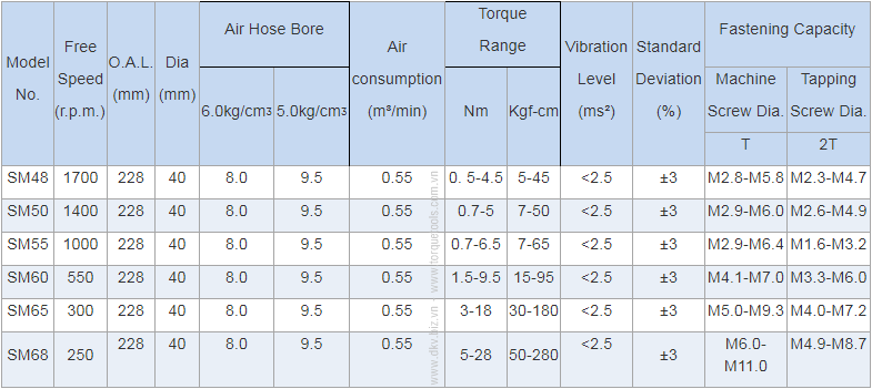- Tô vít lực khí nén Sumake SM48 sử dụng áp khí nén đầu vào: 6 - 12 bar, với lưu lượng: 0.55 m³/min. Tốc độ vòng quay không tải: 1700 rpm. Sai số chế tạo đối với lực siết: +/-3%.
