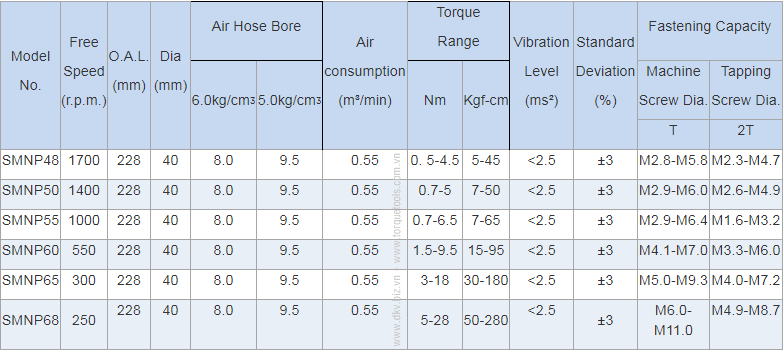 - Tô vít lực khí nén Sumake SMNP48 sử dụng áp khí nén đầu vào: 6 - 12 bar, với lưu lượng: 0.55 m³/min. Tốc độ vòng quay không tải: 1700 rpm. Sai số chế tạo đối với lực siết: +/-3%.