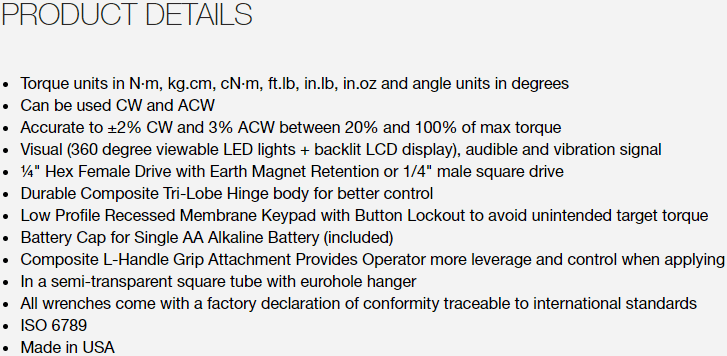 - Các đơn vị đo: in N·m, kg.cm, cN·m, ft.lb, in.lb, in.oz, (đèn LED có thể xem 360 độ + màn hình LCD có đèn nền), âm thanh và tín hiệu rung.