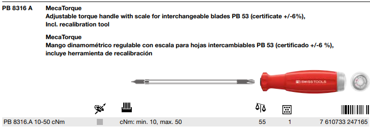 - Sai số chế tạo: +/- 6%. Sử dụng vít chuyên dụng PB 53 của PB Swiss, kết nối với tô vít lực PB 8316.A 10-50 cNm kiểu cắm rút nhanh.