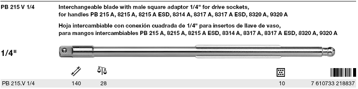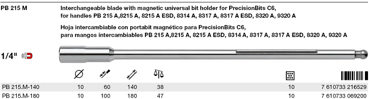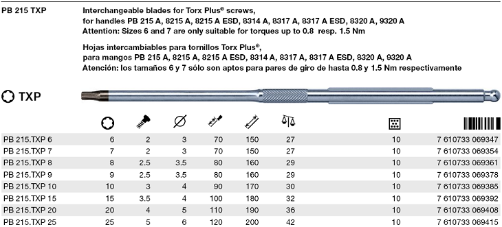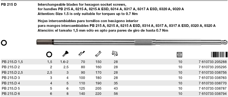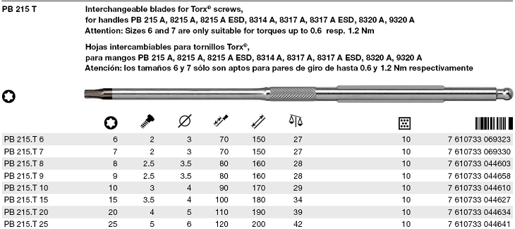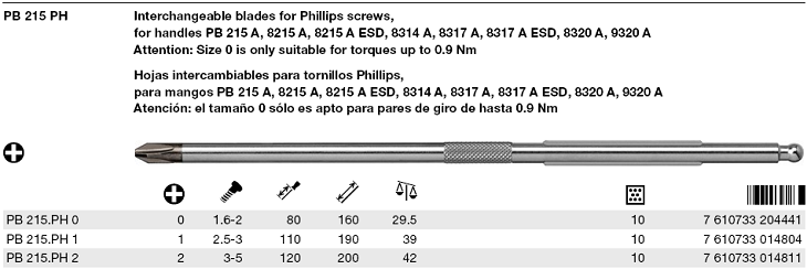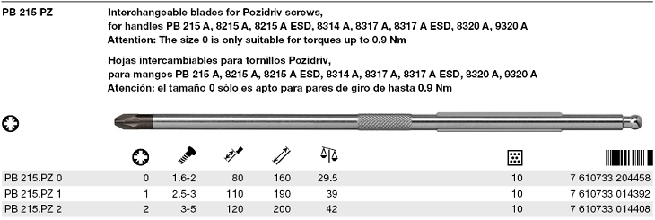 - Sai số chế tạo: +/- 6%. Sử dụng vít chuyên dụng PB 215 của PB Swiss, kết nối với tô vít lực PB 8317.A 0,4-2,0ESD kiểu cắm rút nhanh.