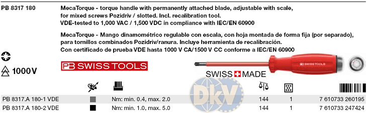 - Tô vít lực cách điện PB Swiss PB 8317.A 180-1 VDE, PB Swiss VDE Torque scewdriver PB 8317.A 180-1 VDE có dải lực siết: 0.4 - 2.0 N.m, chuyên dùng để siết chính xác lực đối với các vít Slot PZ1, trong môi trường điện cao thế (< 1.000 VAC/1.500 VDC).