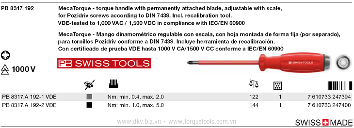 - Tô vít lực cách điện PB Swiss PB 8317.A 192-2 VDE, PB Swiss VDE Torque scewdriver PB 8317.A 192-2 VDE có dải lực siết: 1 - 5 N.m, chuyên dùng để siết chính xác lực đối với các vít PZ2, trong môi trường điện cao thế (< 1.000 VAC/1.500 VDC).