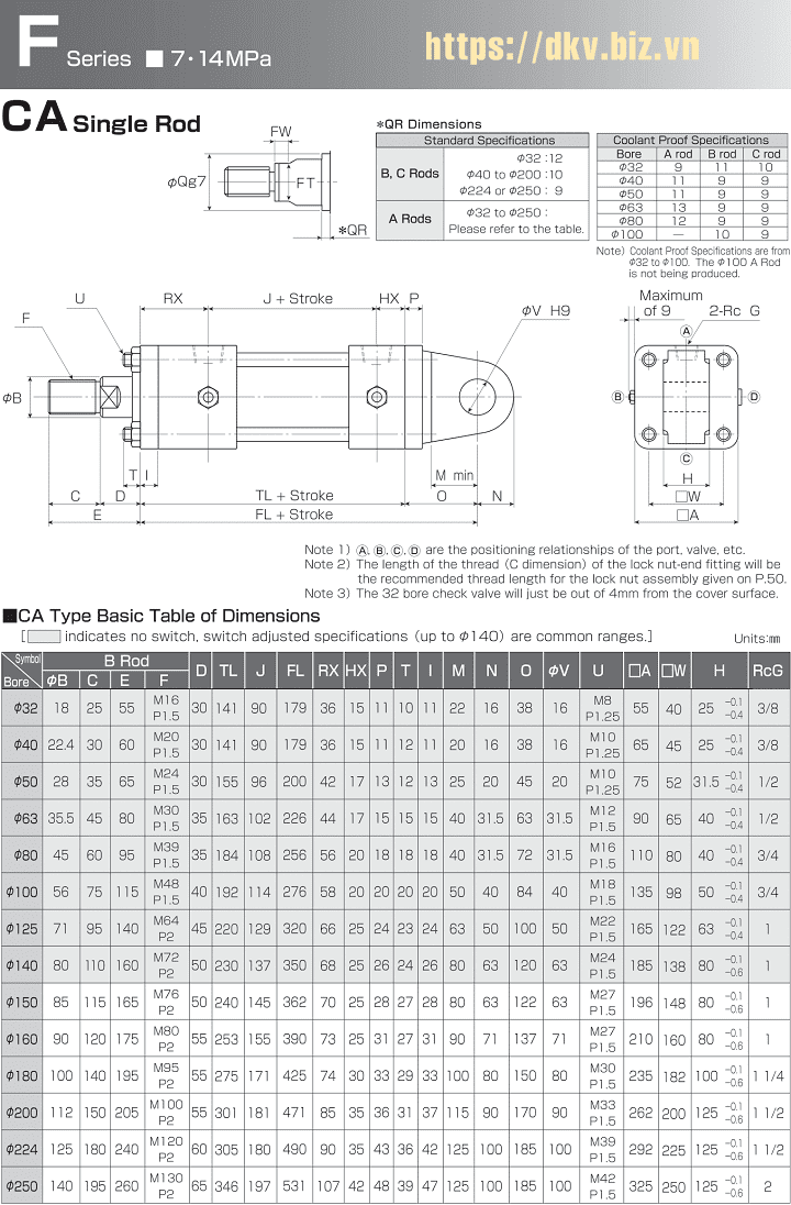 - Xy lanh thủy lực Horiuchi dòng F (kiểu CA Single Rod) có đường kính xy lanh: Ø32 ÷ Ø 250 mm, với hành trình max: 1.200 - 2.000 mm.