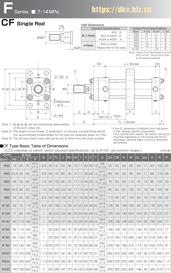 - Xy lanh thủy lực Horiuchi dòng F (kiểu CF Single Rod) có đường kính xy lanh: Ø32 ÷ Ø 250 mm, với hành trình max: 1.200 - 2.000 mm.