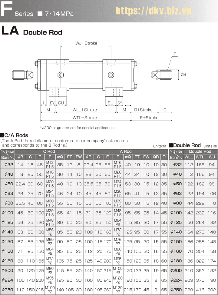- Xy lanh thủy lực Horiuchi dòng F (kiểu LA Double Rod) có đường kính xy lanh: Ø32 ÷ Ø 250 mm, với hành trình max: 1.200 - 2.000 mm.