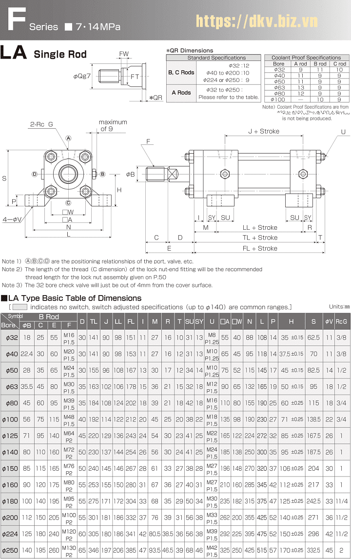 - Xy lanh thủy lực Horiuchi dòng F (kiểu LA Single Rod) có đường kính xy lanh: Ø32 ÷ Ø 250 mm, với hành trình max: 1.200 - 2.000 mm.