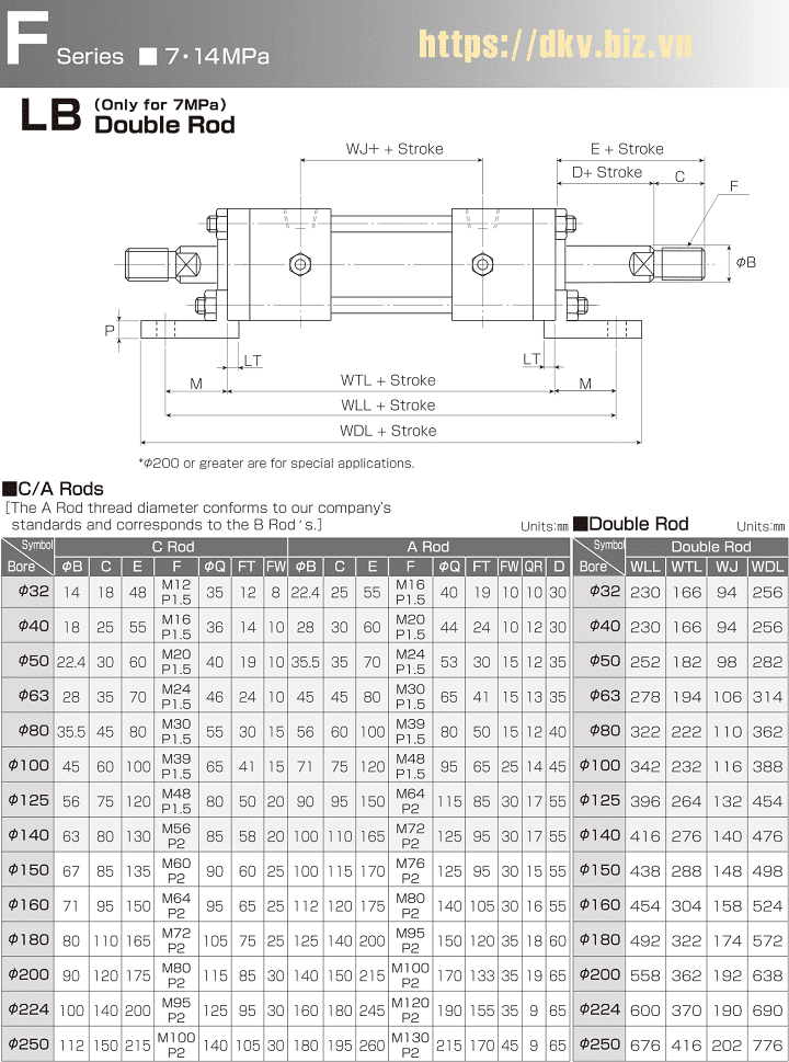 - Xy lanh thủy lực Horiuchi dòng F (kiểu LB Double Rod) có đường kính xy lanh: Ø32 ÷ Ø 250 mm, với hành trình max: 1.200 - 2.000 mm.