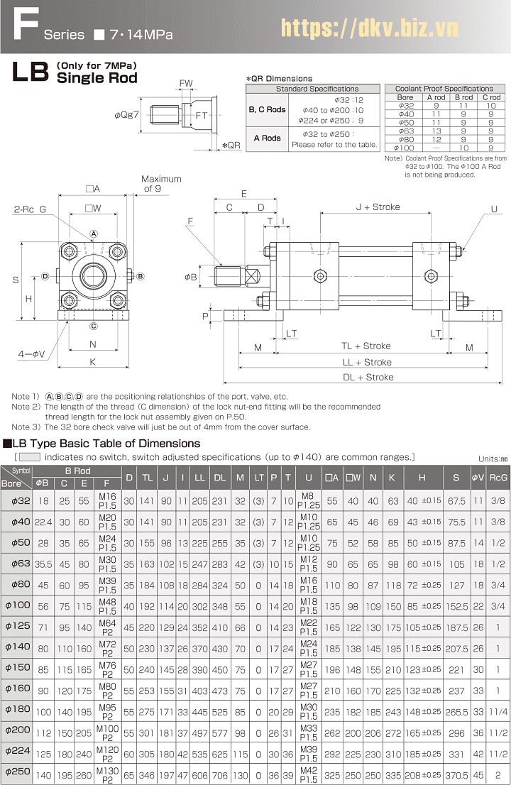 - Xy lanh thủy lực Horiuchi dòng F (kiểu LB Single Rod) có đường kính xy lanh: Ø32 ÷ Ø 250 mm, với hành trình max: 1.200 - 2.000 mm.