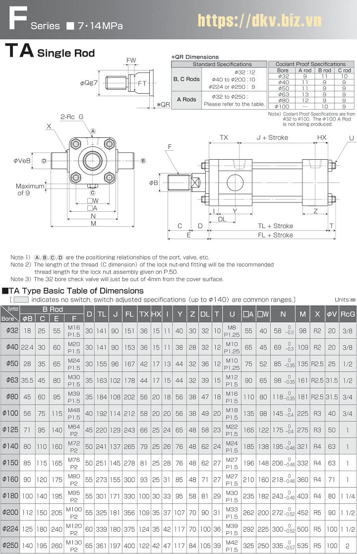 - Xy lanh thủy lực Horiuchi dòng F (kiểu TA Single Rod) có đường kính xy lanh: Ø32 ÷ Ø 250 mm, với hành trình max: 1.200 - 2.000 mm.