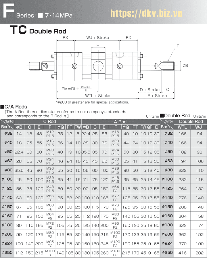 - Xy lanh thủy lực Horiuchi dòng F (kiểu TC Double Rod) có đường kính xy lanh: Ø32 ÷ Ø 250 mm, với hành trình max: 1.200 - 2.000 mm.