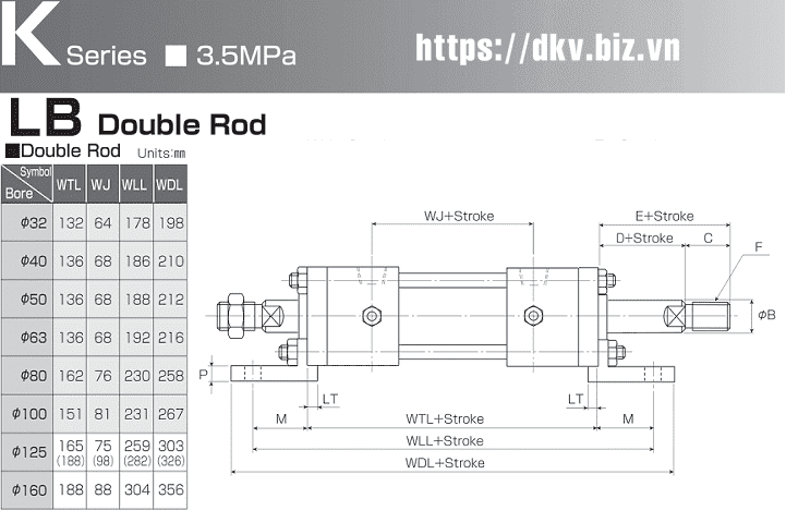 - Xy lanh thủy lực Horiuchi dòng K (kiểu LB Double Rod) có đường kính xy lanh: Ø32 ÷ Ø 160 mm, với hành trình max: 1.000 - 1.800 mm.
