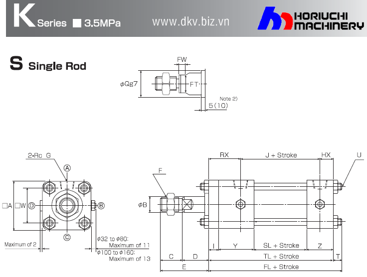 - Xy lanh thủy lực Horiuchi dòng K (kiểu S Single Rod) có đường kính xy lanh: Ø32 ÷ Ø 160 mm, với hành trình max: 1.000 - 1.800 mm.