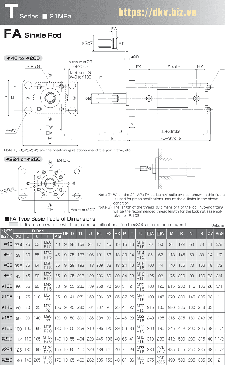 - Xy lanh thủy lực Horiuchi dòng T (kiểu FA Single Rod) có đường kính xy lanh: Ø40 ÷ Ø 250 mm, với hành trình max: 1.500 - 2.000 mm.