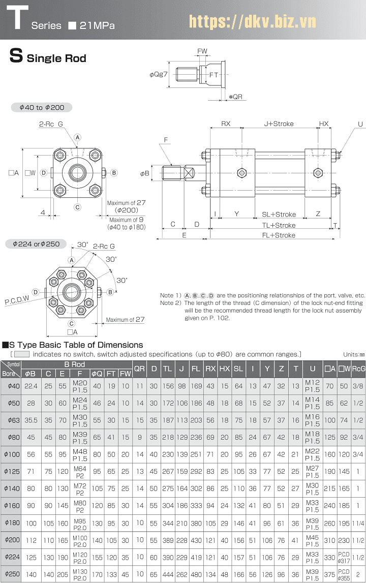 - Xy lanh thủy lực Horiuchi dòng T (kiểu S Single Rod) có đường kính xy lanh: Ø40 ÷ Ø 250 mm, với hành trình max: 1.500 - 2.000 mm.